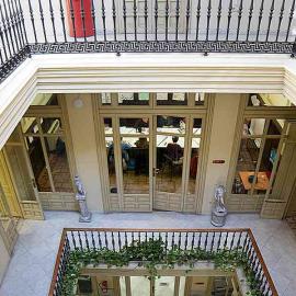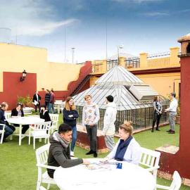 A beautiful mansion, Spanish language school in Seville features a 400 square meter green terrace with breathtaking views of the city and the Giralda. It encompasses 1,200 m² which comprise 14 large classrooms, a modern computer room, a well-stocked library, conference room, public areas, and a classic Andalusian patio covered with Triana tiles.
